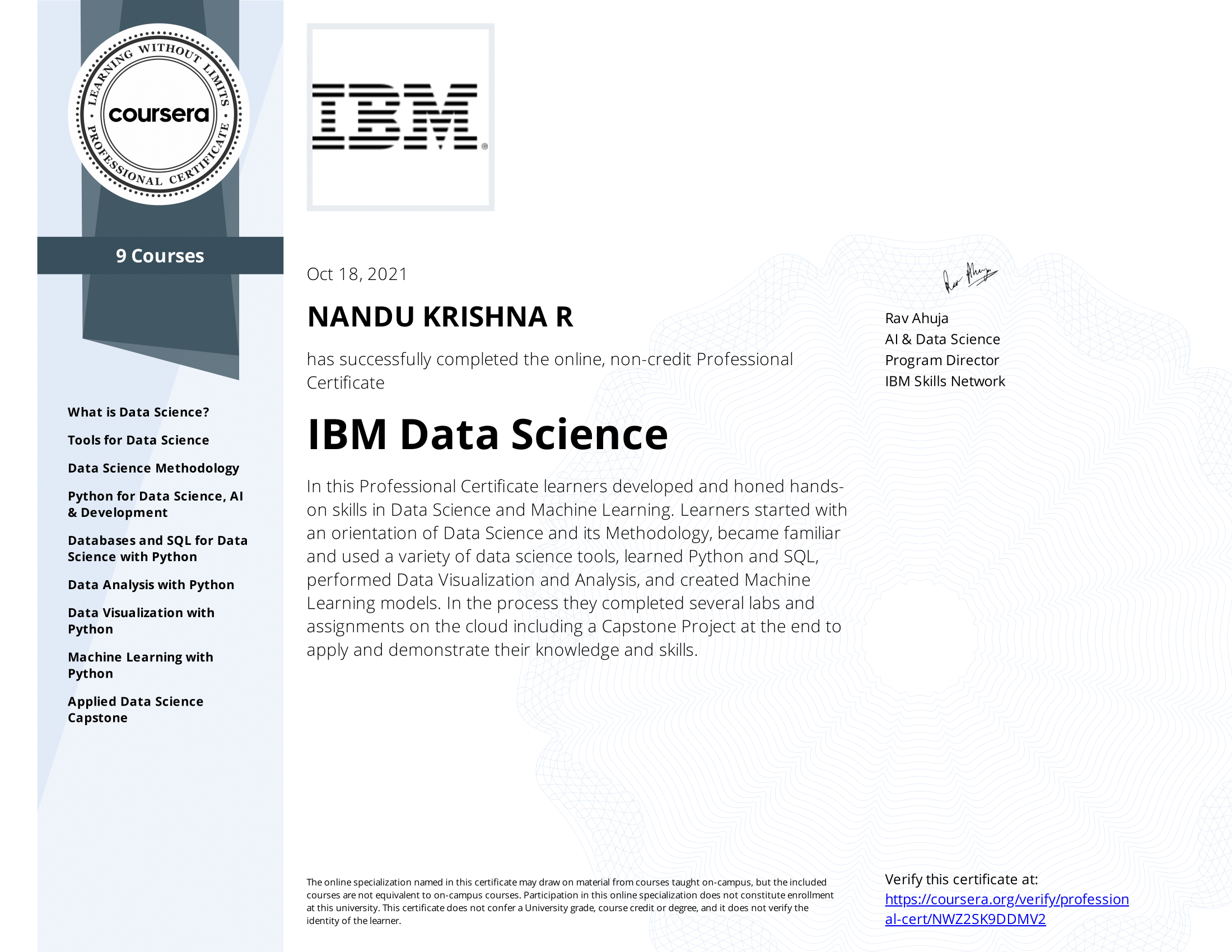 Earned the IBM Data Science Professional Certificate, gaining hands-on expertise in Data Science and Machine Learning. The program covered a comprehensive range of topics, including Python, SQL, Data Visualization, and Machine Learning. Through cloud-based labs and assignments, I applied data science tools and methodologies, culminating in a Capstone Project that showcased my ability to analyze data and build predictive models.